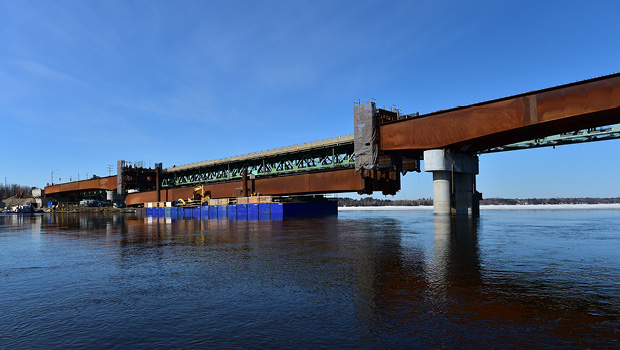 La structure, formée de deux poutres caissons découpées en 22 segments, comprend 1 880 tonnes de composantes d'acier. La complexité de ce projet se caractérise par le poids élevé des poutres caissons allant jusqu'à 91 tonnes et par son échéancier serré.